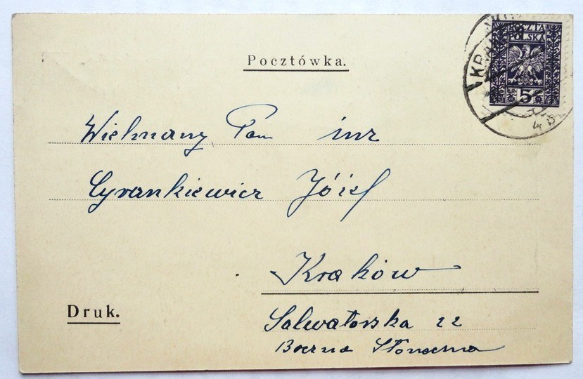 Brak danych wydawniczych. Pocztówka ze znaczkiem, zaadresowana do Józefa Cyrankiewicza, zapewne ojca premiera. Stan bardzo dobry.