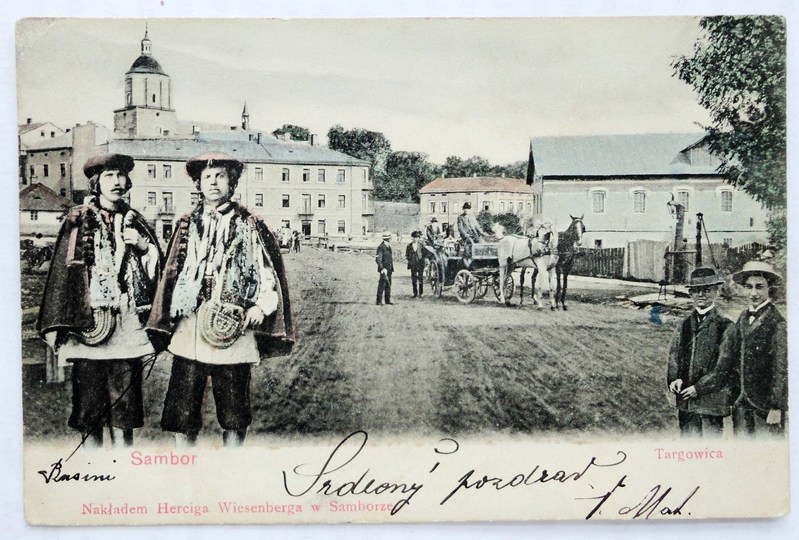 Nakładem Herciga Wiesenberga w Samborze. Pocztówka z długą linią adresową. Z korespondencją, znaczkiem i dwoma stemplami pocztowymi. Niewielkie zaplamienia, stan ogólny dobry.