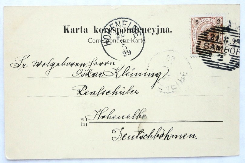 Nakładem Ant. Milewski. Pocztówka z długą linią adresową. Z korespondencją dat.: "21/8. 99", znaczkiem i dwoma stemplami pocztowymi. Stan bardzo dobry.