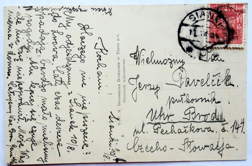 Wyd. M. Grossmann Drukarnia w Turce n/S. Z korespondencją, znaczkiem i stemplem pocztowym z dat.: "11 VIII 34". Miejscowe zaplamienia, poza tym stan dobry.