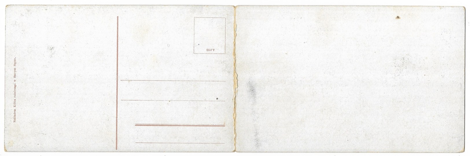 Nakładem Kółka rolniczego w Starym Sączu. Panoramiczna pocztówka składana, form. 8,9x27,9 cm. Bez korespondencji i znaczka. Ślady przetarć na zgięciach i narożnikach, drobne zaplamienia na odwrocie, poza tym stan dobry.