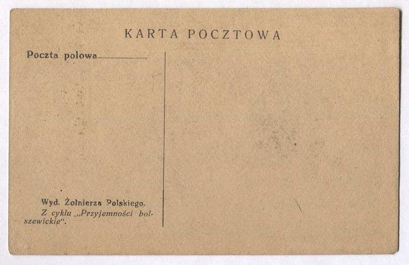 Wyd. Żołnierza Polskiego. Z cyklu: "Przyjemności bolszewickie". Ca 1920. Na odwrocie nadruk "Poczta polowa .....". Kompozycja bez sygnatury (rysował Kamil Mackiewicz?). Pocztówka z czasów wojny polsko-bolszewickiej. Bez korespondencji. Drobne otarcia i załamanie narożnika.