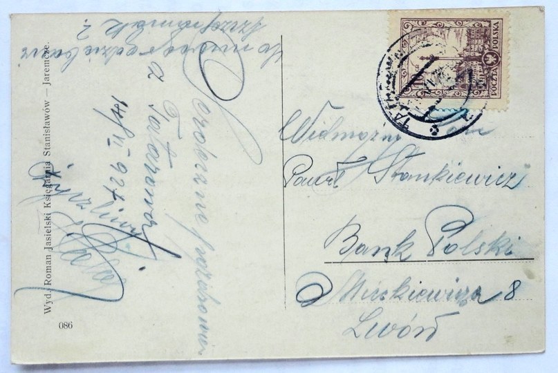 086. Wyd. Roman Jasielski Księgarnia Stanisławów - Jaremcze. Z korespondencją dat.: "? VI 927", znaczkiem i stemplem pocztowym. Niewielkie zaplamienia na odwrocie, stan dobry.