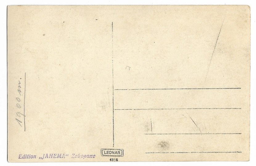 Edition "Jahema" Zakopane (napis wykonany pieczątką). Leonar. 4135. Firma "Jahema" należała do Jana i Heleny Małachowskich. Pocztówka fotograficzna wydana zapewne przed 1917 (data śmierci Jana Małachowskiego, autora zdjęcia). Bez korespondencji i znaczka. Zabrudzenia na odwrocie.