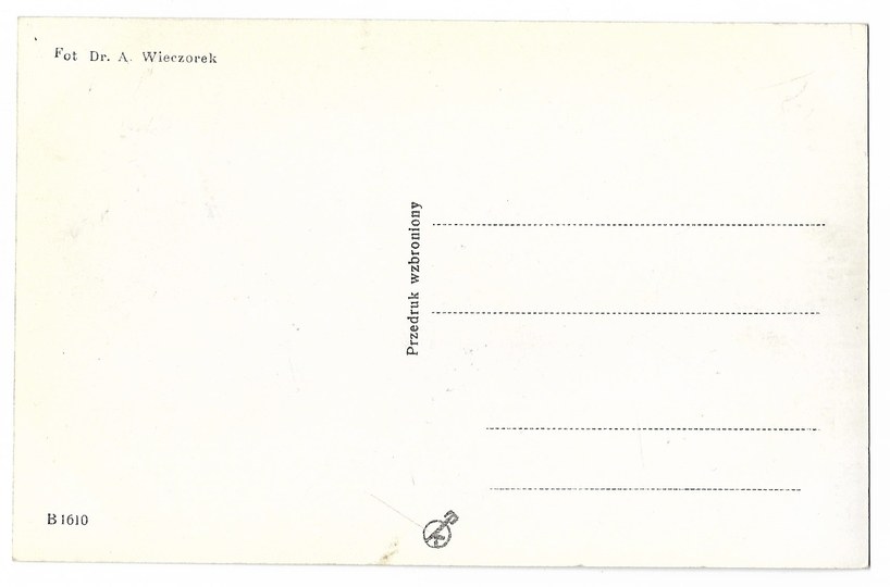 [Polskie Towarzystwo Księgarni Kolejowych "Ruch" S. A. - znak własny wydawcy]. B 1610. Fot. Dr. A. Wieczorek. Sygnatura fotografa na kliszy: AW. Pocztówka fotograficzna. Bez korespondencji i znaczka. Poprzeczne załamanie.