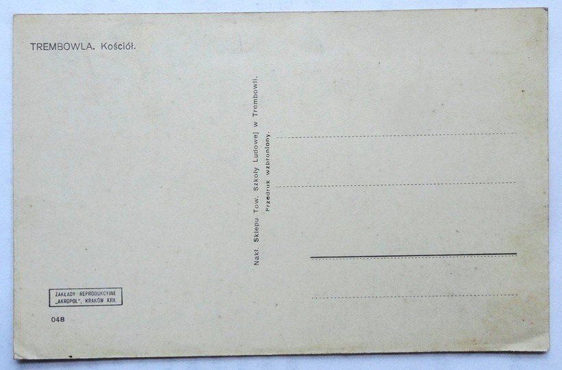 Nakł. Sklepu Tow. Szkoły Ludowej w Trembowli. 048. Zakłady Reprodukcyjne "Akropol", Kraków XXII. Lata 30. XX w.? Bez korespondencji i znaczka. Miejscowe zaplamienia.