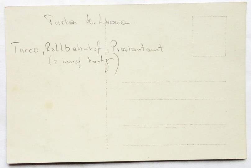 Brak danych wydawniczych. Na odwrocie odręcznie ołówkiem: "Turka k. Lwowa. Turce, Rollbahnhof, Proviantamt (z innej karty)". Lata 20. XX w.? Bez korespondencji i znaczka. Stan dobry.