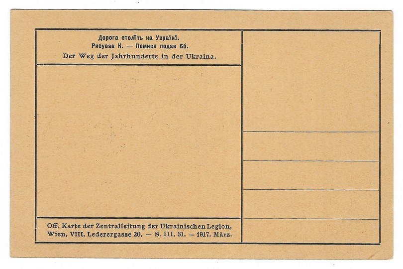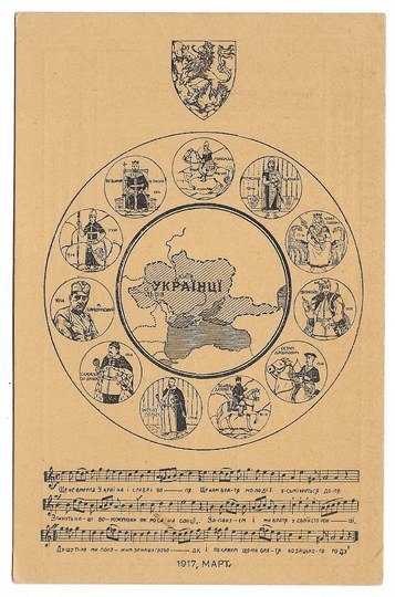 Off. Karte der Zentralleitung der Ukrainischen Legion. Vien, VIII Lederergasse 20. S. III. 81. 1917. März. Na stronie widokowej schematyczna mapka Ukrainy, jej herb i jedenaście osobistości, które odegrały ważną rolę w jej historii. Poniżej słowa i nuty hymnu Ukrainy. Bez znaczka i korespondencji. Stan bardzo dobry.