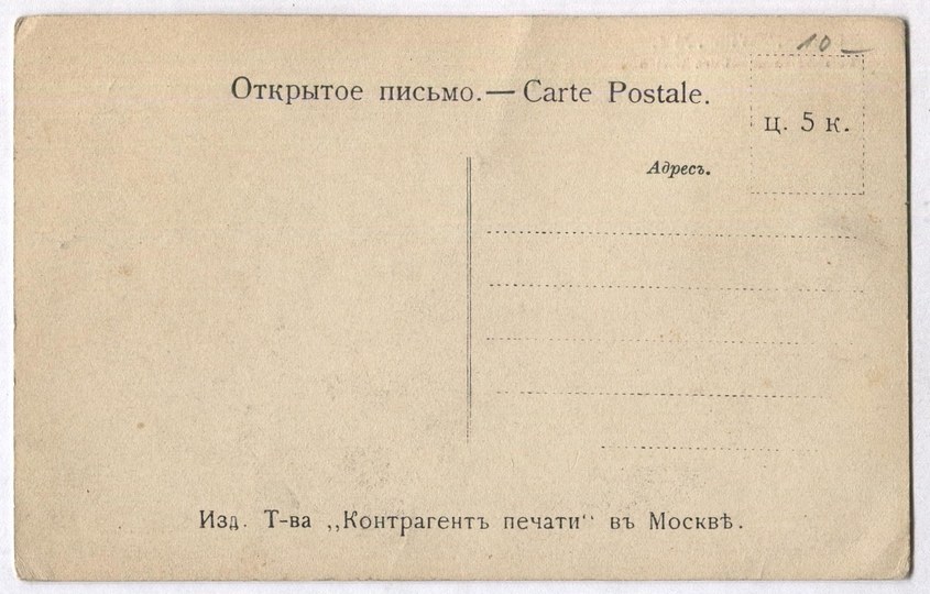 Izd. T-va "Kontragent pečati" v Moskve. Druga dekada XX w.? Bez korespondencji i znaczka. Otarcia narożników, niewielkie zaplamienie.
