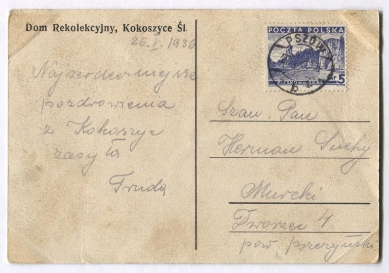Bez danych wydawniczych. Nie po 1936. Kokoszyce to obecnie dzielnica Wodzisława Śl. Z korespondencją i znaczkiem. Data stempla 27 V 1936. Otarcia krawędzi, zaplamienia na odwrocie.