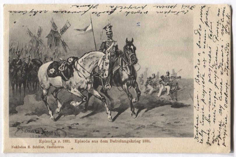 Nakładca E. Schiller, Czerniowce. Reprodukcja obrazu Juliusza Kossaka z 1901. Z korespondencją i znaczkiem. Stempel z 1901. Lekkie zagniecenia narożników - efekt przechowywania pocztówki w albumie.