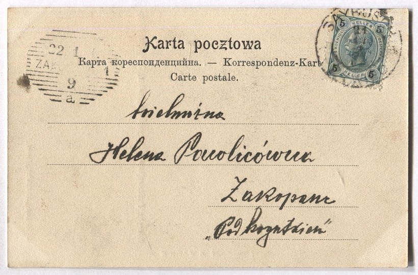 Nakład: S. W. Niemojowski, Lwów. Światłodruk "Eureka", Lwów. Kompozycja Kajetana Saryusza-Wolskiego. Z korespondencją i znaczkiem. Data stempla: 22 XI 1901 (?). Drobne zaplamienia, niewielkie zagniecenia narożników - efekt przechowywania w albumie.