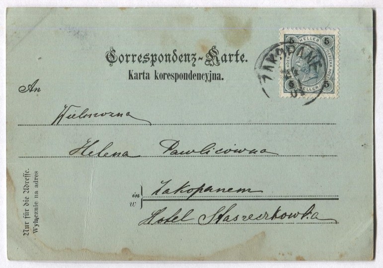 J. F. J. Komendzinski, Zakopane. Z korespondencją i znaczkiem. Stempel z 1901. Zaplamienie dolnej części pocztówki.