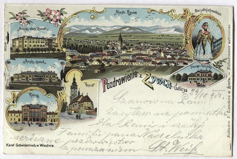 [ŻYWIEC]. Pozdrowienie z Żywca - Galicya. Miasto Żywiec, Arcyks. stary Zamek, Arcyks. zamek, Ratusz, Kosciół, Stary strój obywatelski, Dworzec Kolejowy.