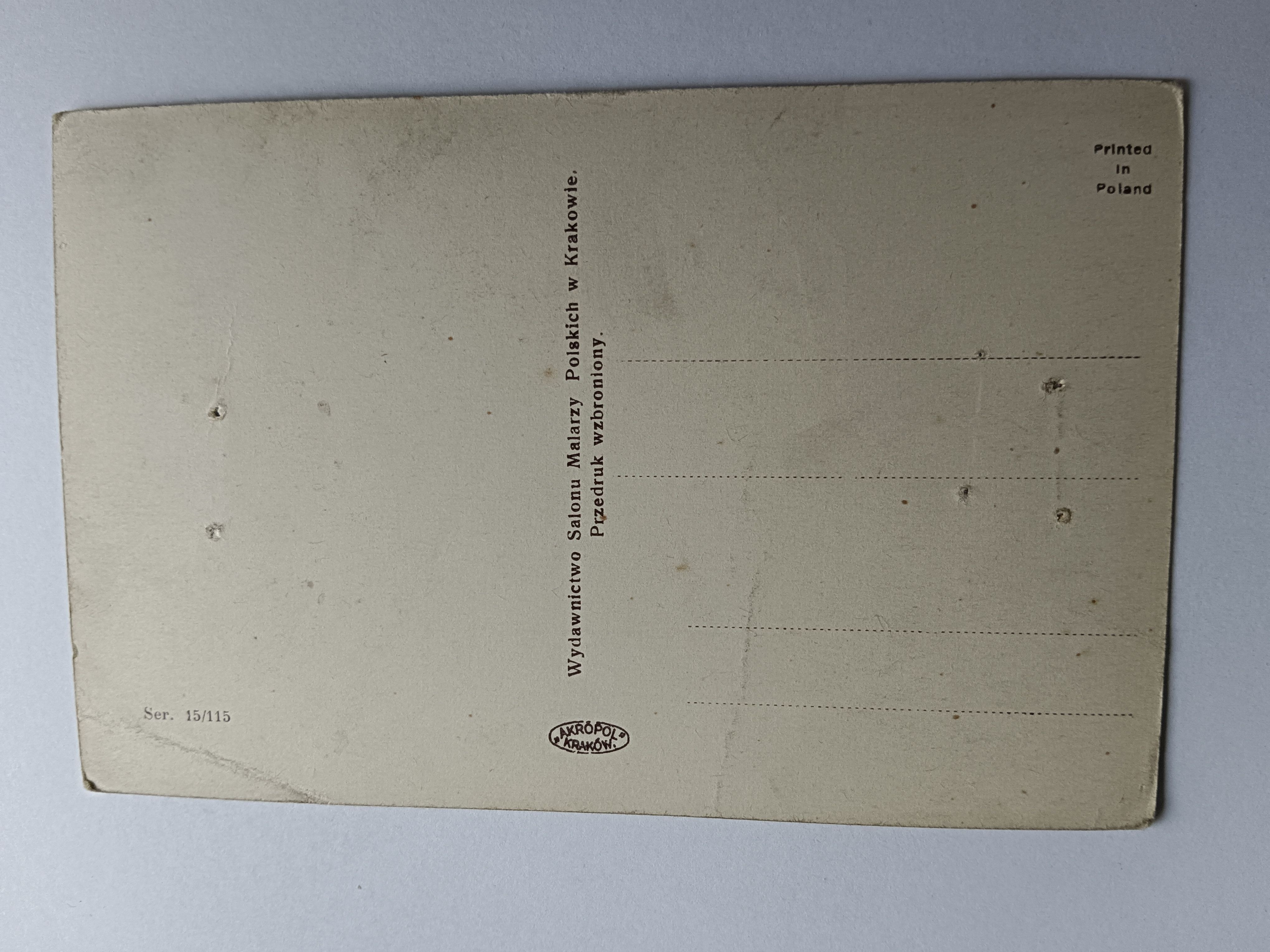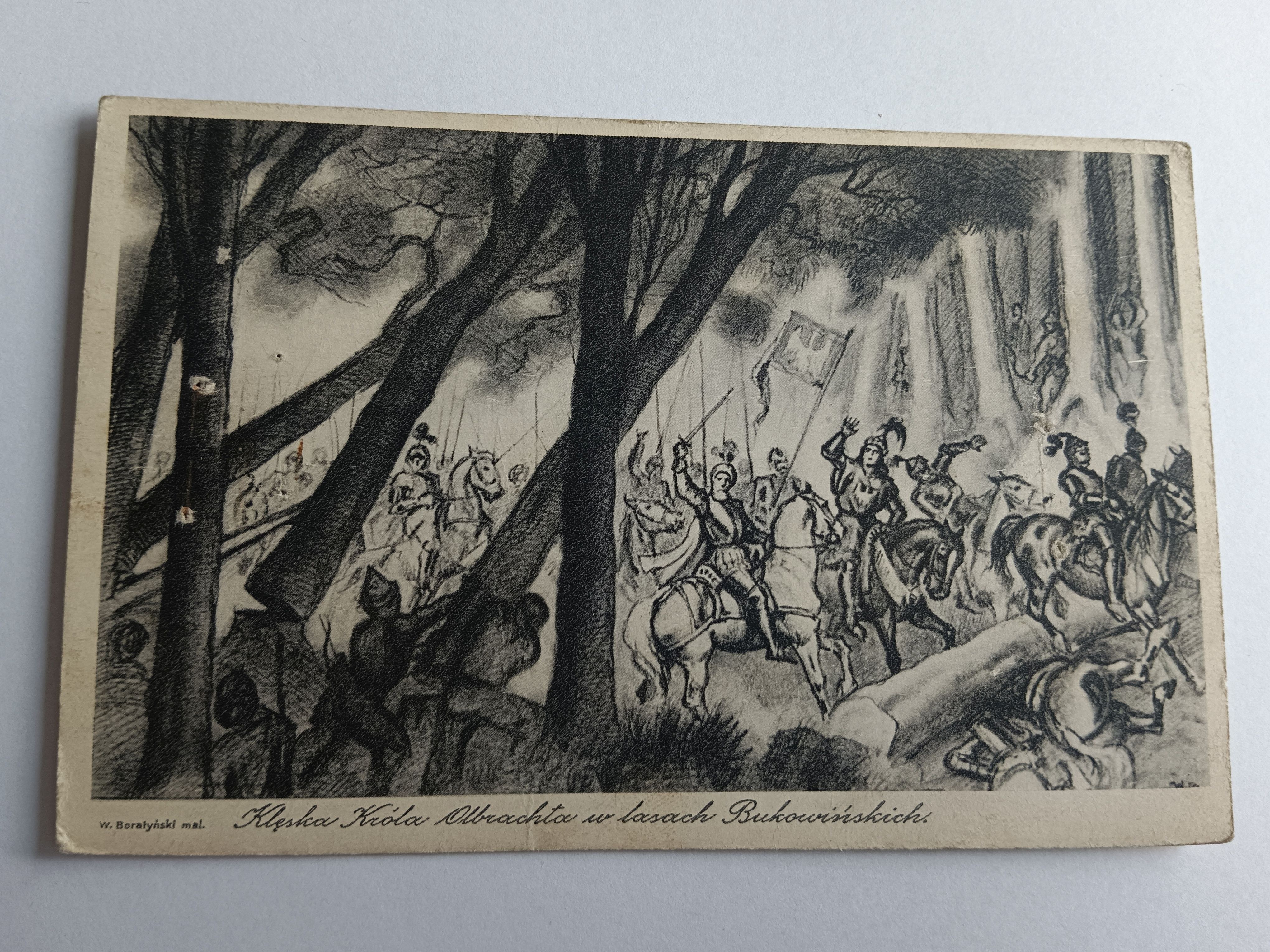 POCZTÓWKA MALARSTWO POLSKIE BORATYŃSKI KLĘSKA KRÓLA OLBRACHTA W LASACH BUKOWIŃSKICH, PRZEDWOJENNA, USZKODZONA
