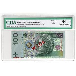 100 złotych 1994, seria AA, WZÓR No. 1054