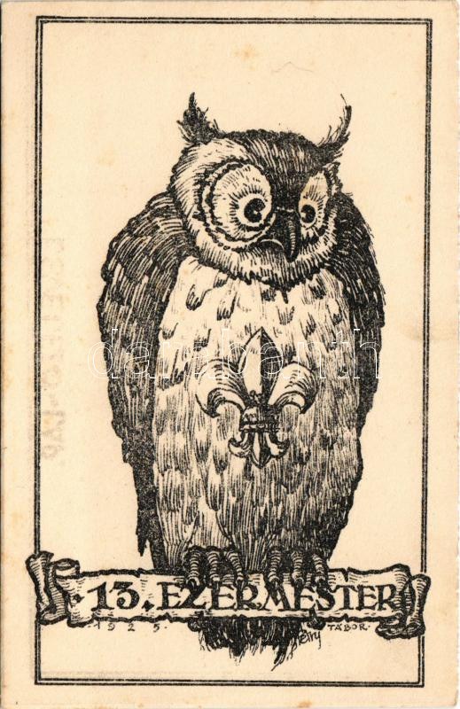 13. ezermester cserkészcsapat, fülesbagoly / Hungarian boy scout art postcard with long-eared owl s: Tábor (fl)