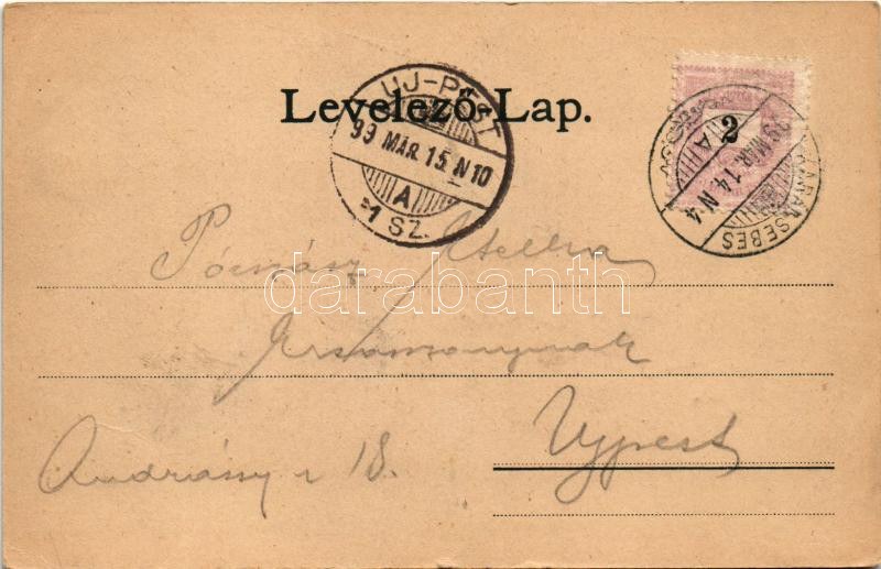 1899 Karánsebes, Caransebes; Hotel zum grünen Baum, Post, Isr. Tempel u. Umgebung, H. Rosenfelds Geschaftslocale / Szálloda a zöld fához, postahivatal, izraelita templom, zsinagóga és környéke, H. Rosenfeld üzlete és saját kiadása / hotel, post office, synagogue, publisher's shop. Art Nouveau, floral (EB)