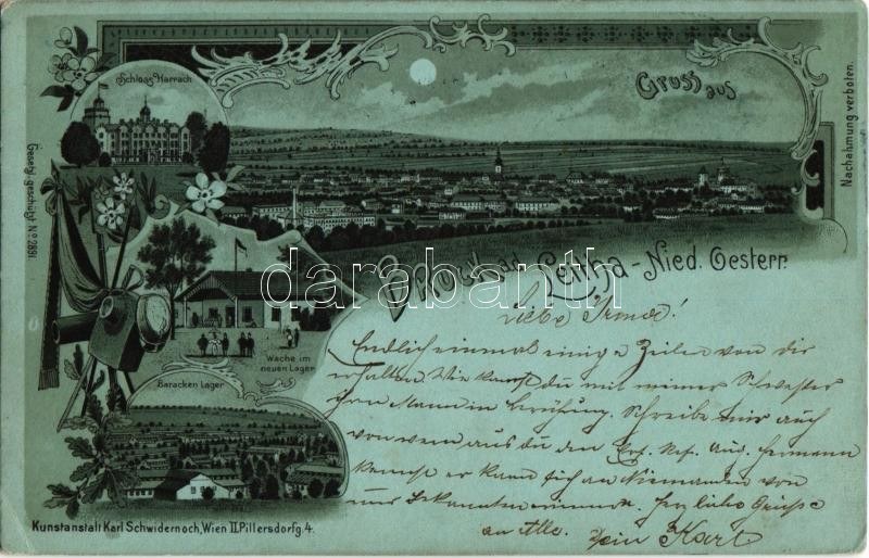 1899 Lajtabruck, Bruck an der Leitha; Harrach kastély, laktanya és őrség / Schloss, Wache im neue Lager, Baracken Lager / castle, k.u.k. military barracks with guard. Kunstanstalt Karl Schwidernoch Art Nouveau, floral, litho (EK)