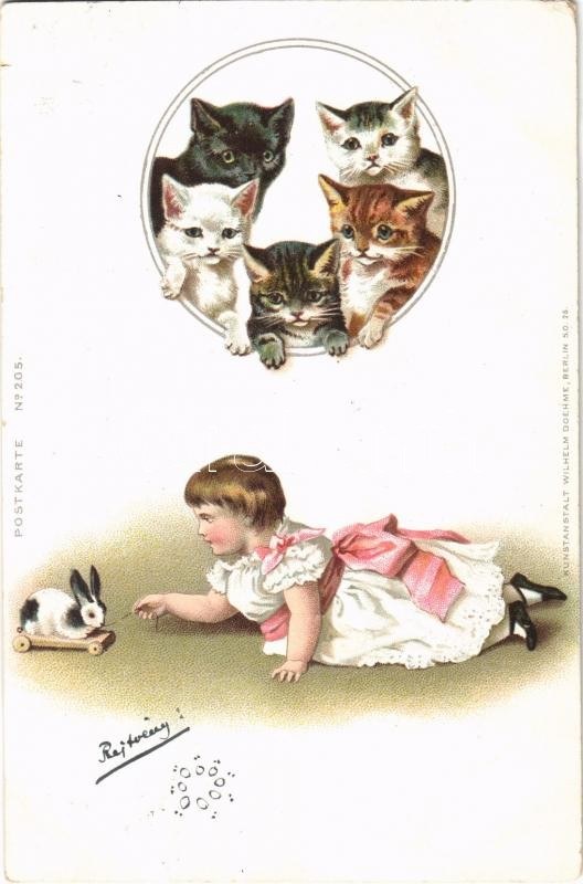 1899 (Vorläufer) Macskák, kislány nyuszis játékkal / Cats, little girl with toy rabbit. Kunstanstalt Wilhelm Boehme Postkarte No. 205. litho