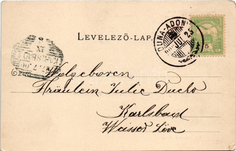1900 Adony, Duna-Adony; Római katolikus templom, Országút, Városháza és tűzőrség, tűzoltószertár, Pável István üzlete és saját kiadása (EM)