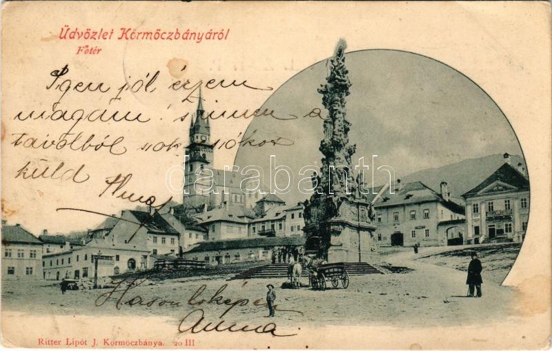 1900 Körmöcbánya, Kremnitz, Kremnica; Fő tér, Szentháromság szobor. Ritter Lipót J. kiadása / main square...