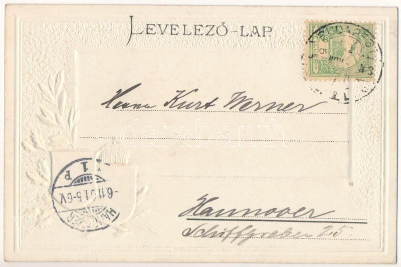 1901 Budapest, Lánchíd, Lipótváros egy része és a Bazilika. Magyar címeres dombornyomott litho keret / Emb. litho frame with Hungarian coat of arms (lyuk / pinhole)