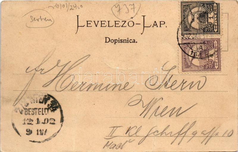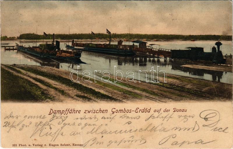 1902 Dálya, Dalja, Dalj; Gőzkomp Gombos és Erdőd között a Dunán, gőzmozdony kompra állítása. Phot. u. Verlag v. Eugen Selzer / Dampffähre zwischen Gombos-Erdőd auf der Donau / steam ferry with freight train between Bogojevo and Erdut on the Danube, locomotive (fa)