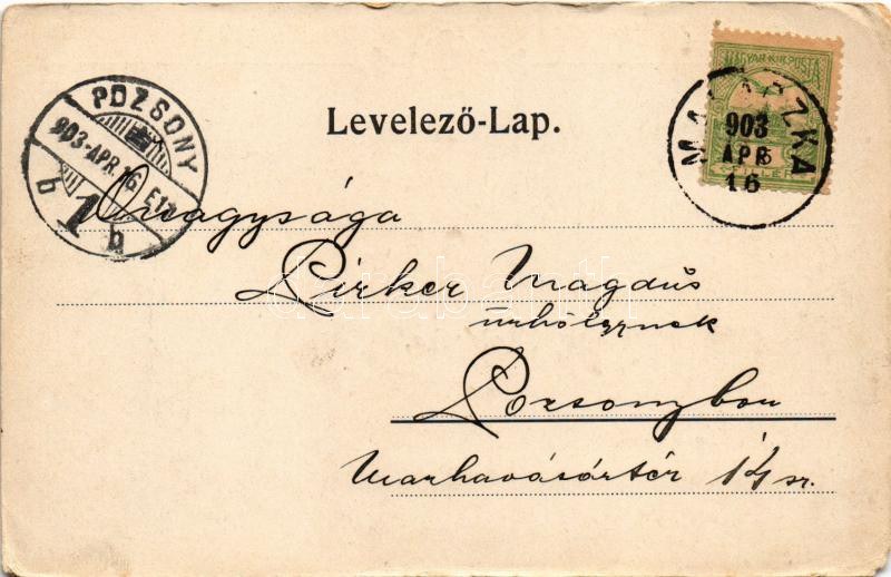 1903 Malacka, Malacky; látkép, kolostor, népviselet. Wiesner Alfréd kiadása, szecessziós-virágos keret / general view, cloister, Upper Hungarian (Slovak) folklore. Art Nouveau, floral frame (EM)