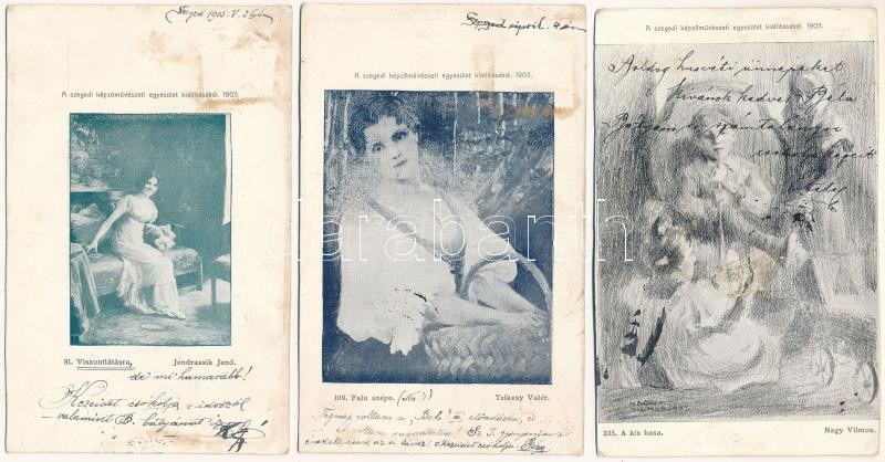 1903 Szeged - 3 db RÉGI képeslap: a Szegedi Képzőművészeti Egyesület kiállításából, Jendrassik Jenő, Nagy Vilmos...