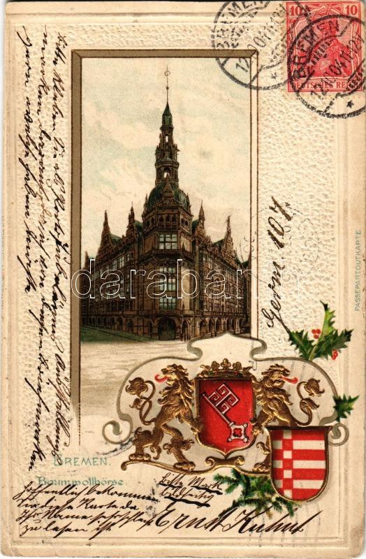 1904 Bremen, Baumwollbörse / cotton exchange palace. Art Nouveau, floral, Emb. litho with coat of arms (pinhole...