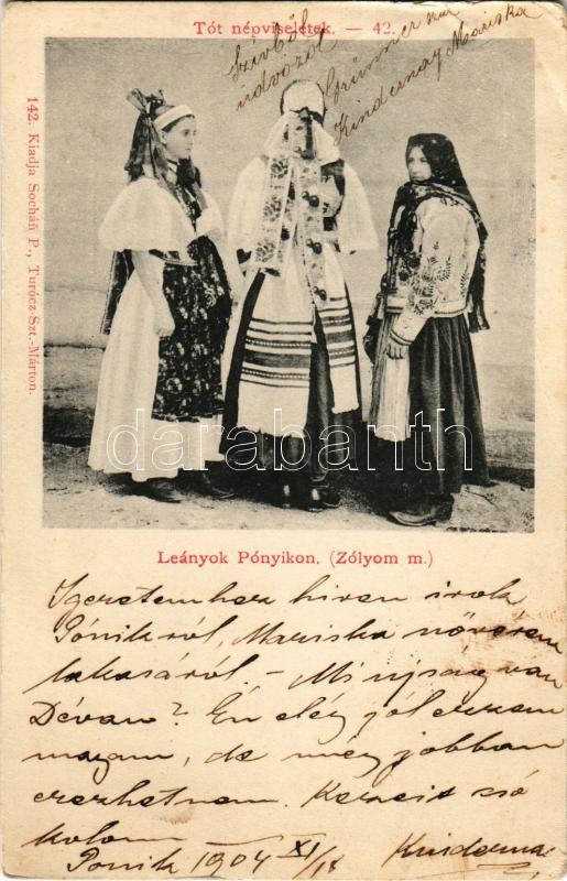 1904 Pónik, Pónyik, Pojnik (Zólyom); Leányok Pónyikon. Tót népviseletek 42. Sochán P. kiadása / Upper Hungarian (Slovak...