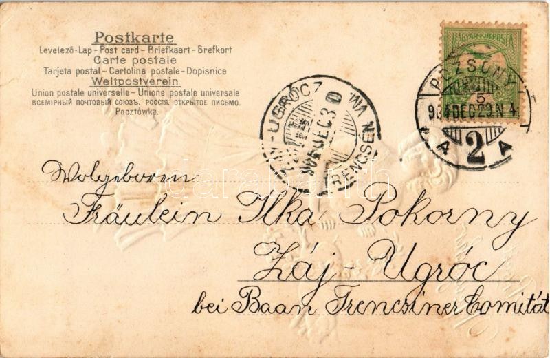 1904 Prosit Neujahr / Lady with pig New Year greeting postcard. Emb (EB)