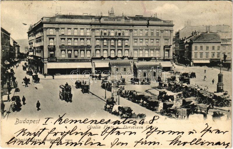 1906 Budapest V. Gizella tér (ma Vörösmarty tér), Takarékpénztár, Pesti Magyar Kereskedelmi Bank, lovas hintók parkolója, Singhoffer Béla üzlete. Damkó Lőrinc kiadása (r)