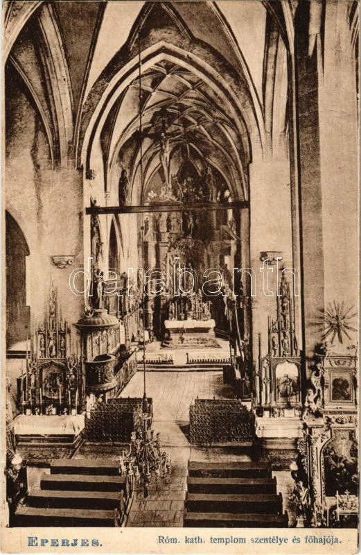 1907 Eperjes, Presov; Római katolikus templom szentélye és főhajója, belső. Báró Barkóczy Sándor (1857-1925) miniszteri tanácsos, császári és királyi kamarásnak címezve. Fénynyomat Divald műintézetéből / Roman Catholic church interior (EK)