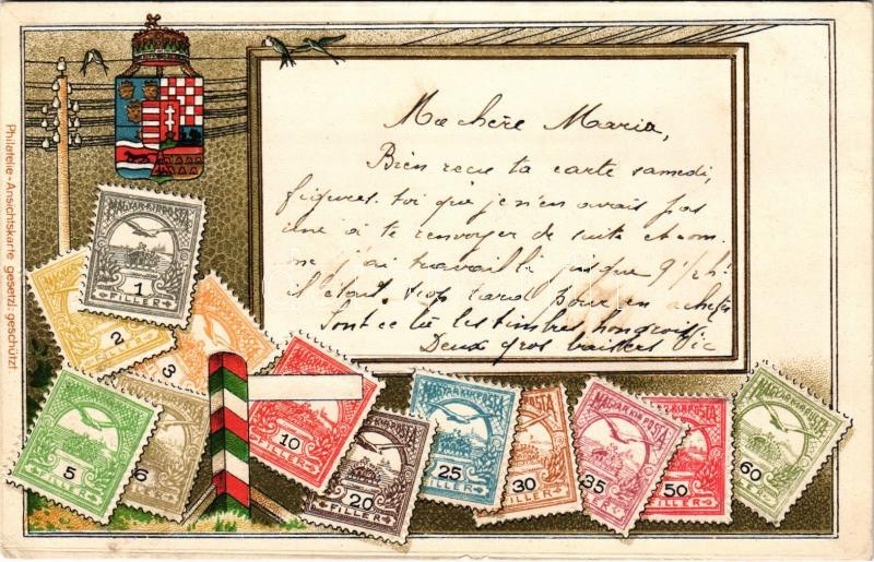 1908 A Magyar Királyi Posta bélyegei, címer / Hungarian stamps and coat of arms. Philatelie-Ansichtskarte. Emb. litho ...
