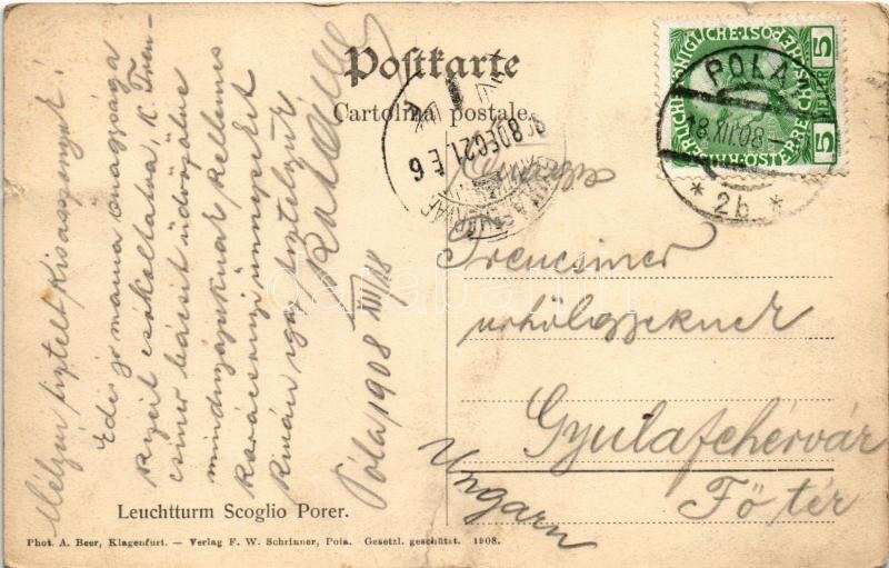 1908 Pola, Leuchtturm Scoglio Porer / Világítótorony / lighthouse. Phot. A. Beer, F.W. Schrinner 1908. (kis szakadás / small tear)