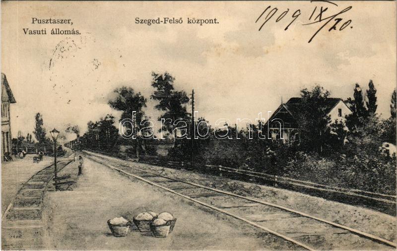 1909 Pusztaszer, Vasútállomás gőzmozdonnyal, Szeged-Felső központ. Grünwald Herman kiadása + "BUDAPEST - BÁZIÁS 4. SZ." vasúti mozgóposta bélyegző (ázott sarkak / wet corners)