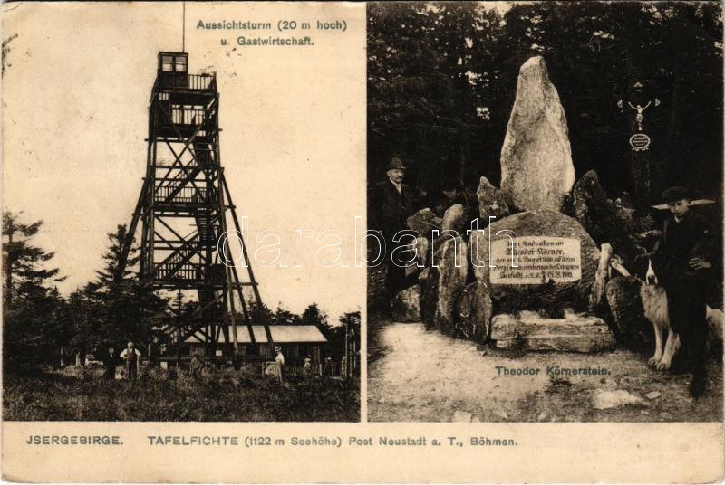 1910 Jizerské hory, Isergebirge, Jizera Mountains; Tafelfichte, Aussichtsturm u. Gatwirtschaft, Theodor Körnerstein / Smrk mountain with lookout tower and restaurant, monument (EK)