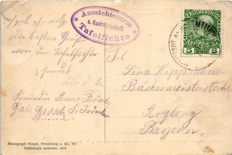 1910 Jizerské hory, Isergebirge, Jizera Mountains; Tafelfichte, Aussichtsturm u. Gatwirtschaft, Theodor Körnerstein ...