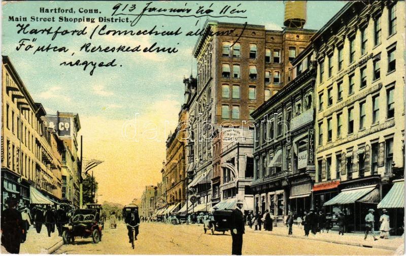 1912 Hartford (Connecticut), Main Street Shopping District, shops of Henry Kohn, William H. Talcott. H. Plevy, automobile (EB)