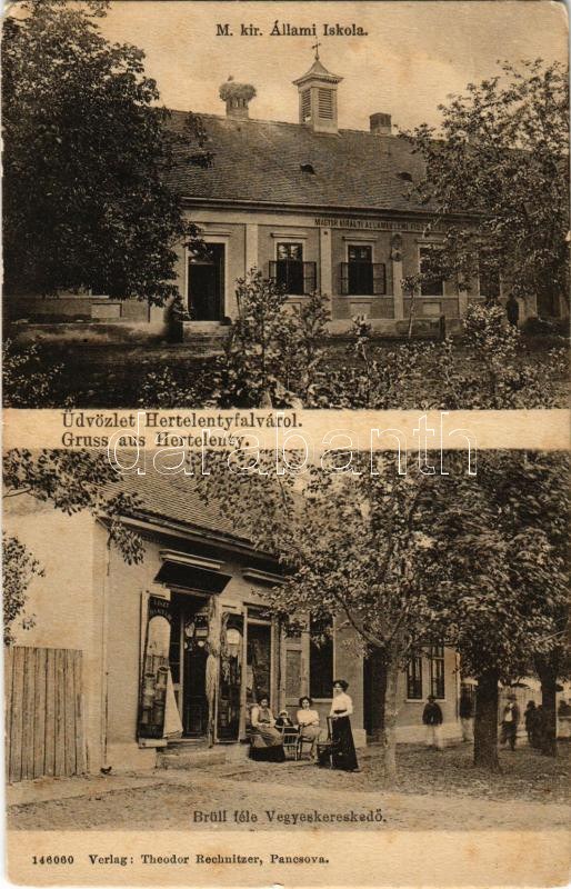 Hertelendyfalva, Hertelenty, Vojlovica; M. kir. állami iskola, Brüll féle vegyeskereskedés üzlete / school, shop ...