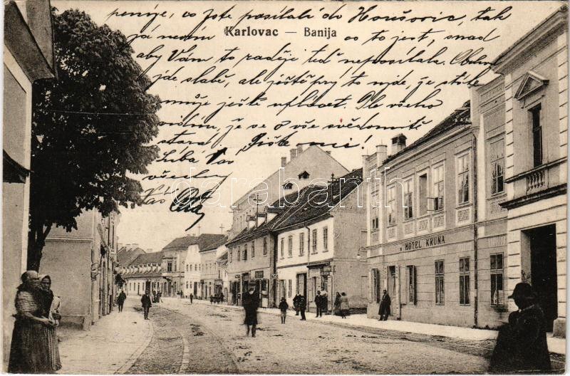 1915 Károlyváros, Karlovac; Banija / Korona szálloda, üzletek / Hotel Kruna, shops + "K.U.K. SPITALZUG No. 21." (EK...