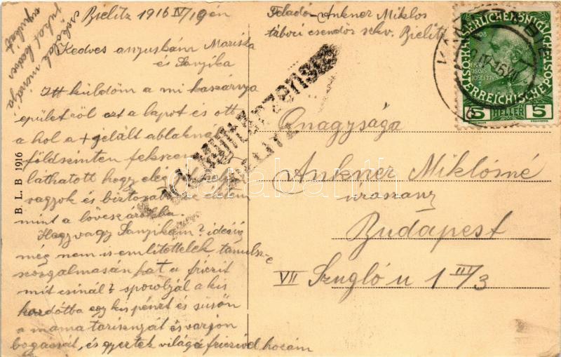1916 Bielsko-Biala, Bielitz; Kavallerie-Kaserne. B. L. B. 1916 / K.u.k. military barracks + "K.u.k. Militärzensur Bielitz" (EB)
