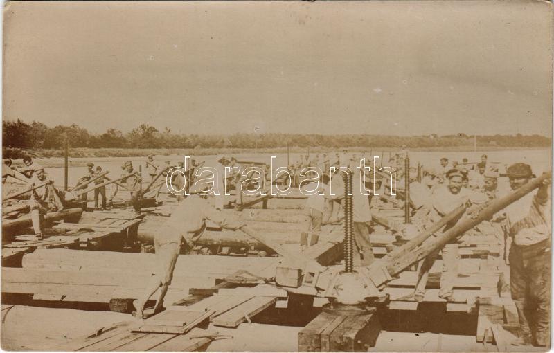 1916 K.u.K. Kriegsmarine Donauflottille / Császári és Királyi Haditengerészet Dunaflottilla elsüllyedt "TEMES" (I) monitor kiemelése, uszály matrózokkal és munkásokkal / WWI Austro-Hungarian Navy Danube Fleet sunken river guard monitor SMS TEMES (I) being raised, mid-June 1916. DDSG Barge 10005, laden with logs, sailors and workmen, is busily working to raise SMS TEMES. photo (EK)