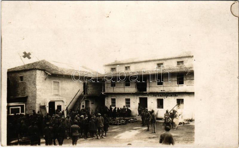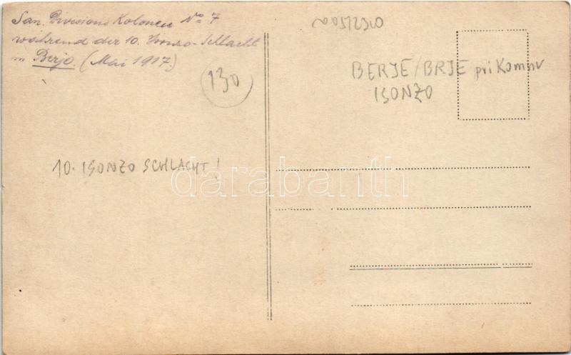 1917 Brje, San. Divisions Kolonne No. 7. während der 10. Isonzo-Schlacht im Berje (Mai 1917) Verbandplatz, K.u.K. Div. San. Kole / WWI Austro-Hungarian K.u.K. military, group of soldiers and medics at the first aid station. photo