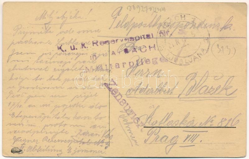 1917 Ljubljana, Laibach; Dunajska cesta / street view, shop of K. Camernik, tram + "K.U.K. RESERVESPITAL Nr. 3. in LAIBACH Militärpflege" (wet damage)