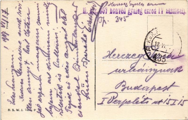 1917 Mode. B.K.W.I. 746-5. s: Mela Koehler + "M. kir. 607. honvéd gyalog ezred IV. zászlóalj" "K.u.k. Feldpostamt 435" (EK)