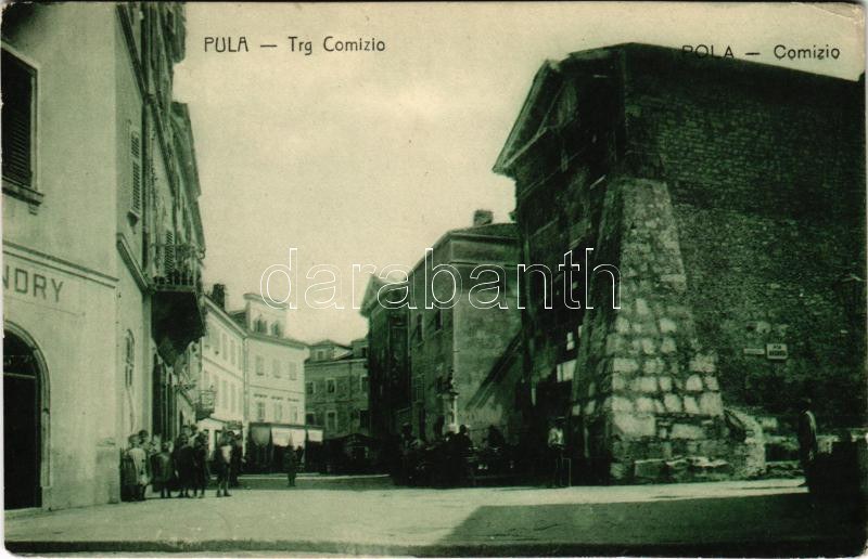 1917 Pola, Pula; Trg Comizio / square, market, shops + "K.u.K. Marinespital Pola Briefzensur" (EK)