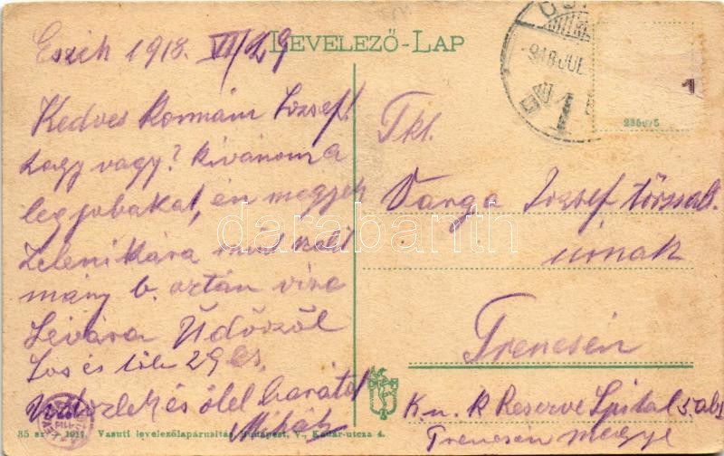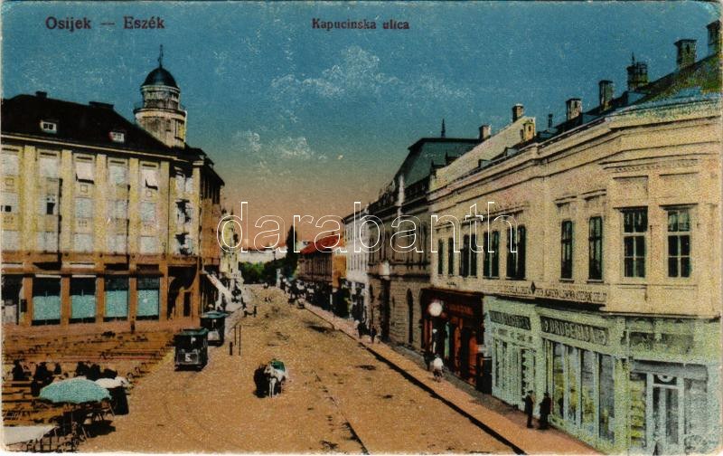 1918 Eszék, Essegg, Osijek; Kapucinska ulica / street view, drugstore, tram, market (Rb)